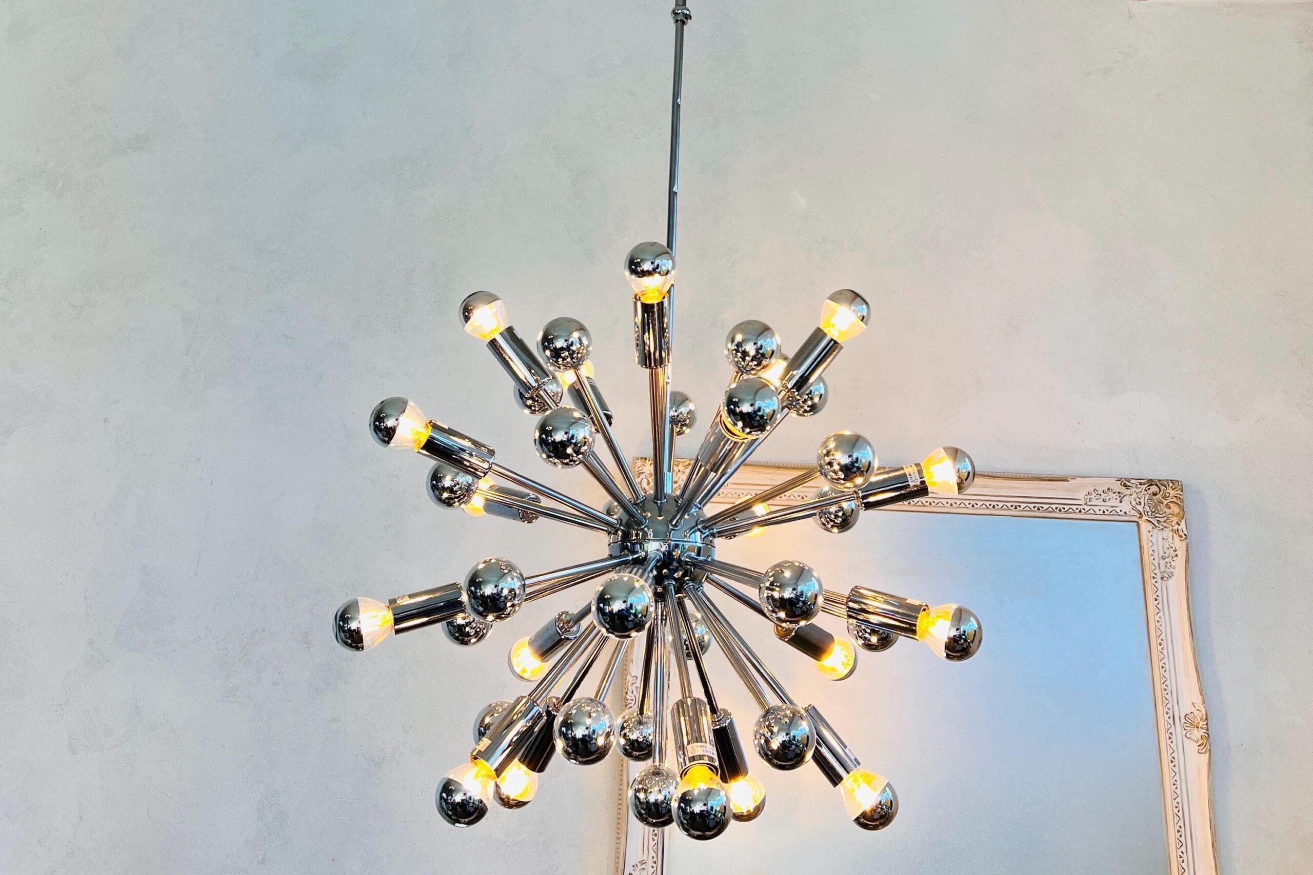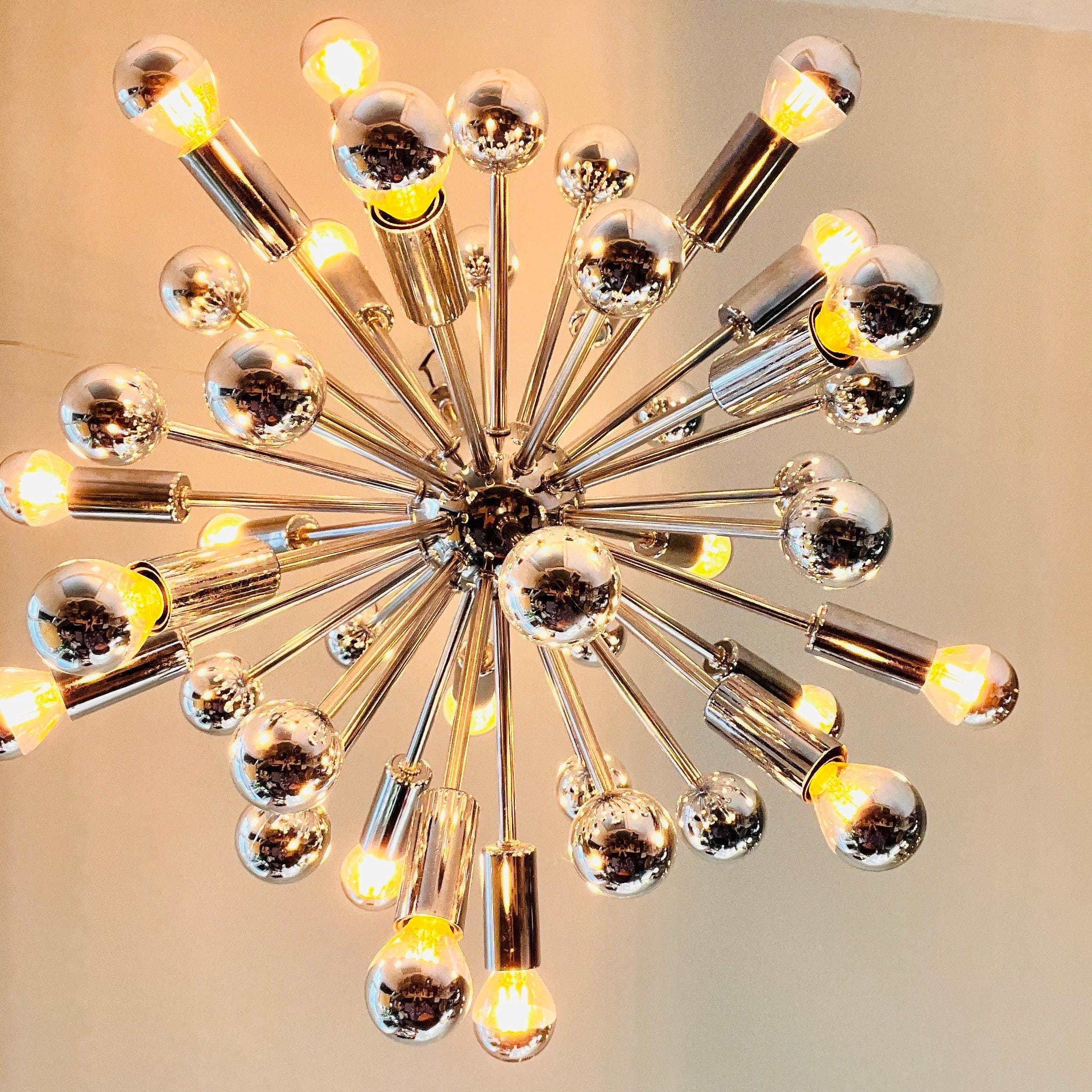 All gleam and motion, this chrome Sputnik chandelier captures the bold spirit of 1970s Space Age design. With radiating arms and polished chrome finish, it’s a statement piece that transforms any ceiling into a page from vintage modernist dreams. Ideal for contemporary interiors with a retro edge or for collectors of sculptural lighting.