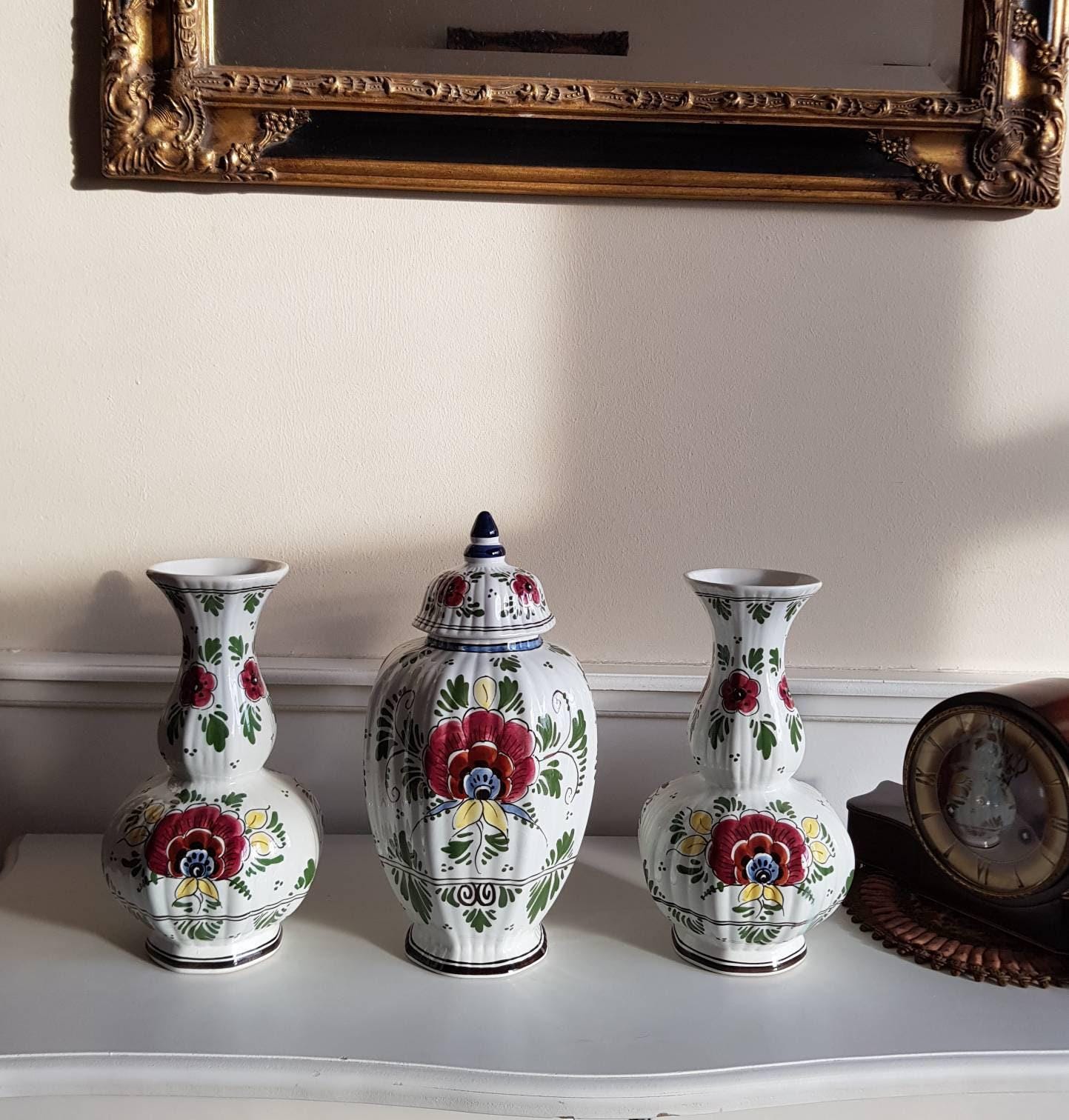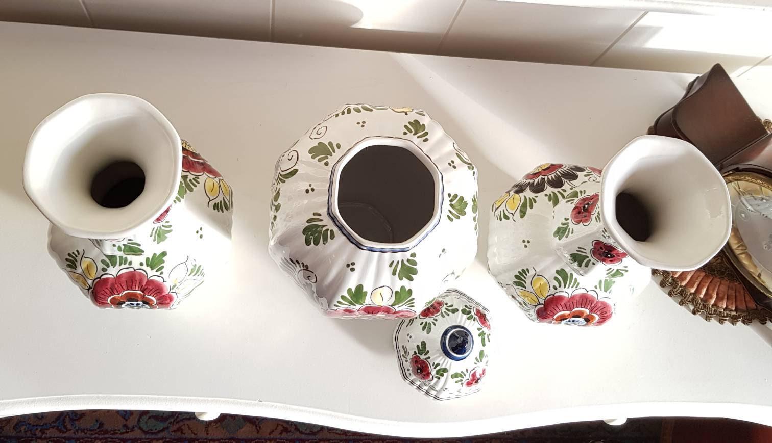 Hand Painted Delft Polychrome Ceramic Ginger Jar Trio with Lidded Vase – Vintage Holland Decorative Vases Set