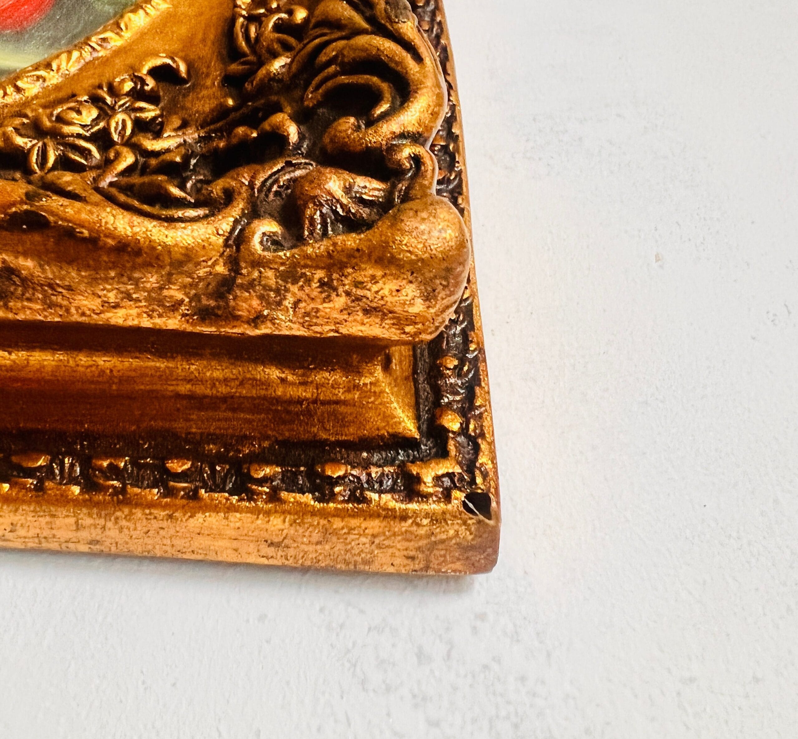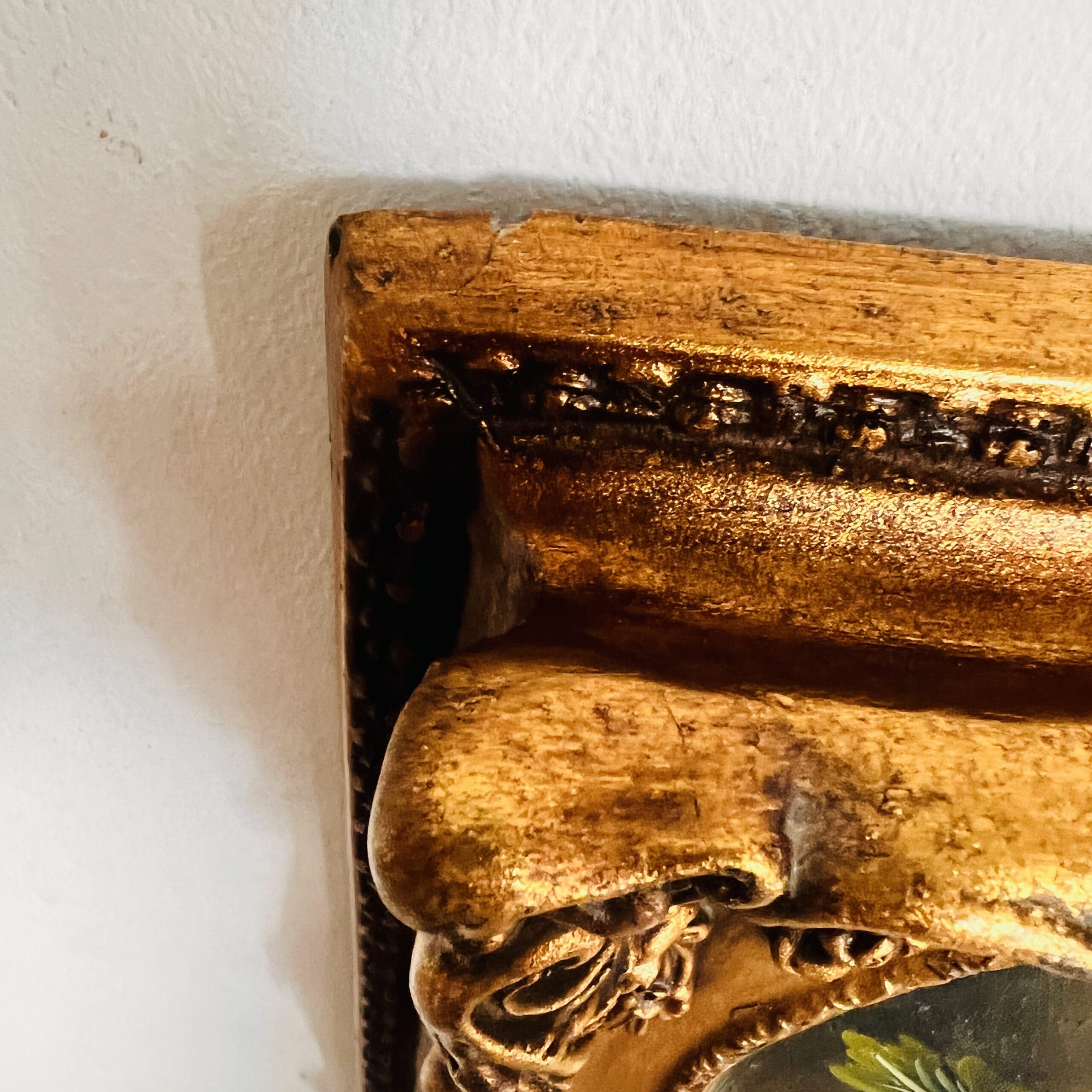 A richly detailed piece that adds instant charm to any room, this hand-painted wood wall art features a golden frame with ornate relief and a unique convex shape. A true treasure for those who appreciate vintage wall decor, it brings warmth and character to curated spaces.