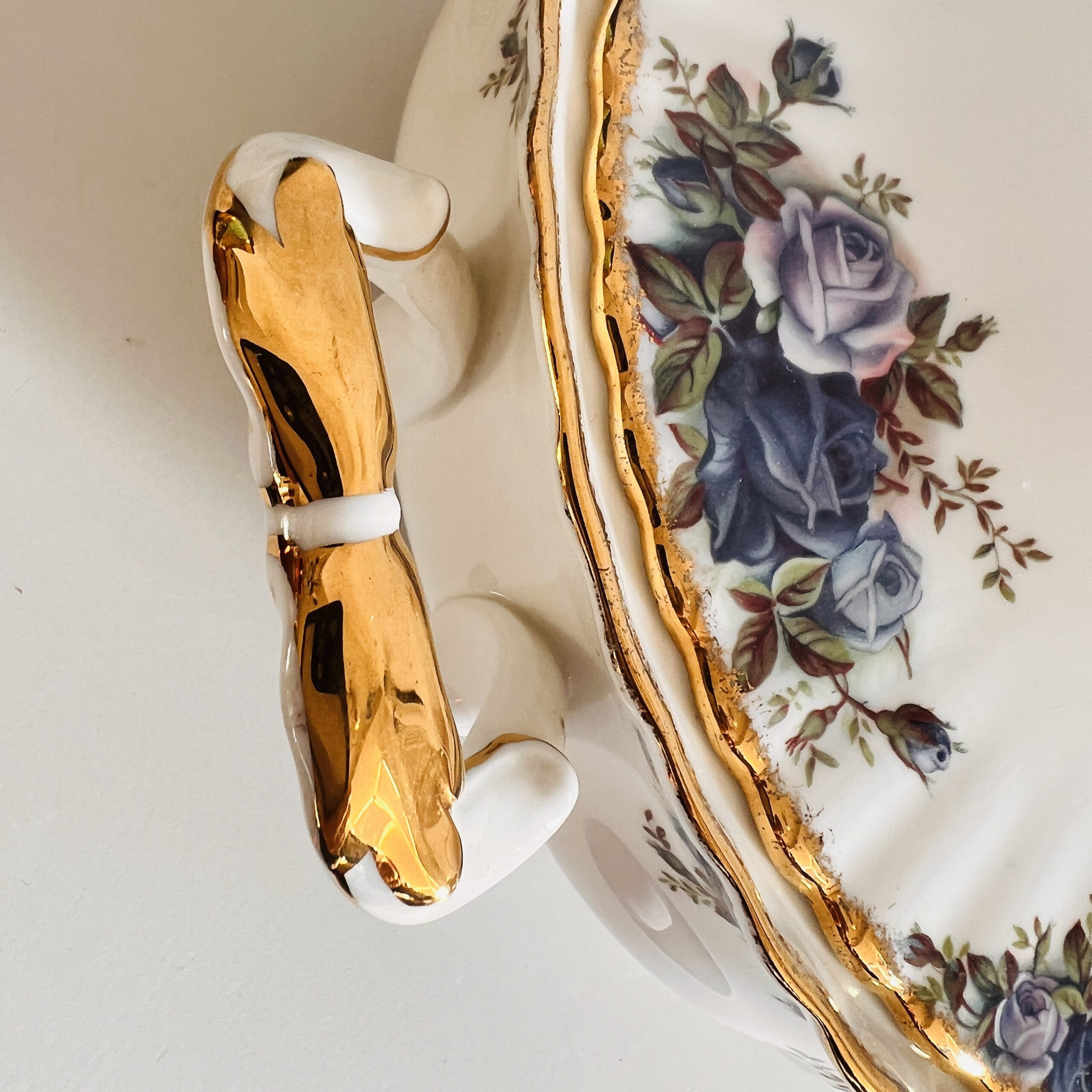 A timeless piece from Royal Albert’s beloved Moonlight Rose collection, this porcelain tureen brings a touch of English charm to any table. Crafted in 1987 and marked 1st Quality, it features delicate blue roses and graceful gold trim, making it a stunning centerpiece or heirloom-worthy serving dish.