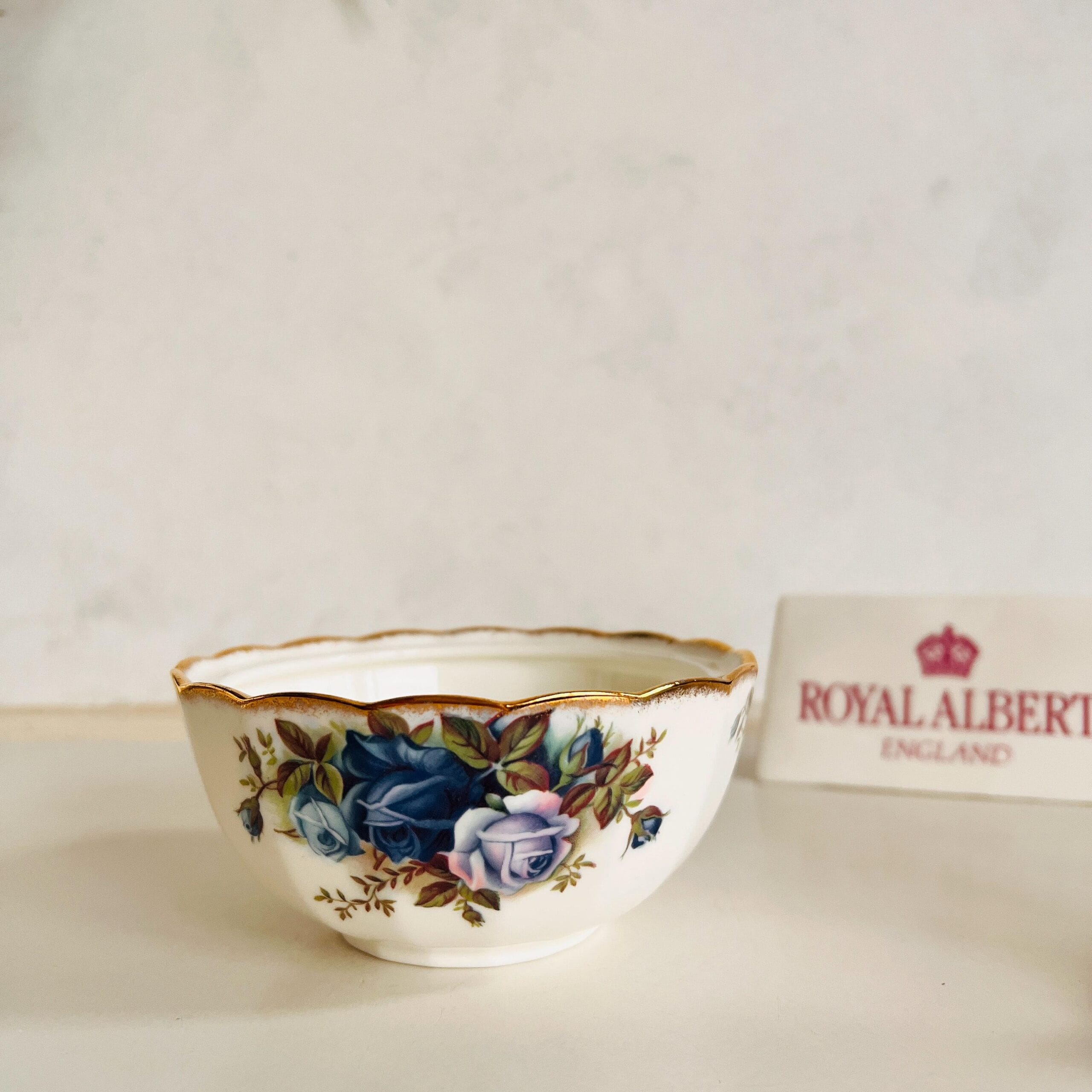 An exquisite piece of fine English porcelain, this Royal Albert Moonlight Rose candy bowl with lid brings a touch of timeless romance to any table or tea setting. Its delicate blue roses, gold trim, and classic silhouette speak to the grace and grandeur of vintage English crockery. Whether used to offer sweets, chocolates, or simply admired on display, it’s the perfect heirloom accent for collectors and hosts alike.