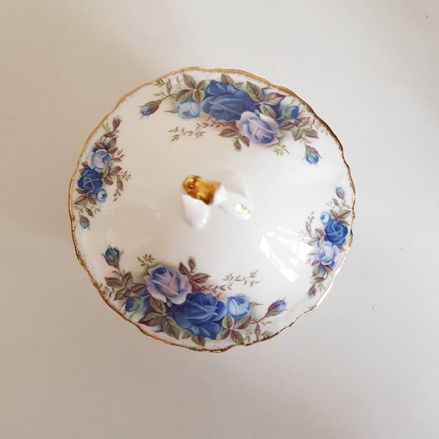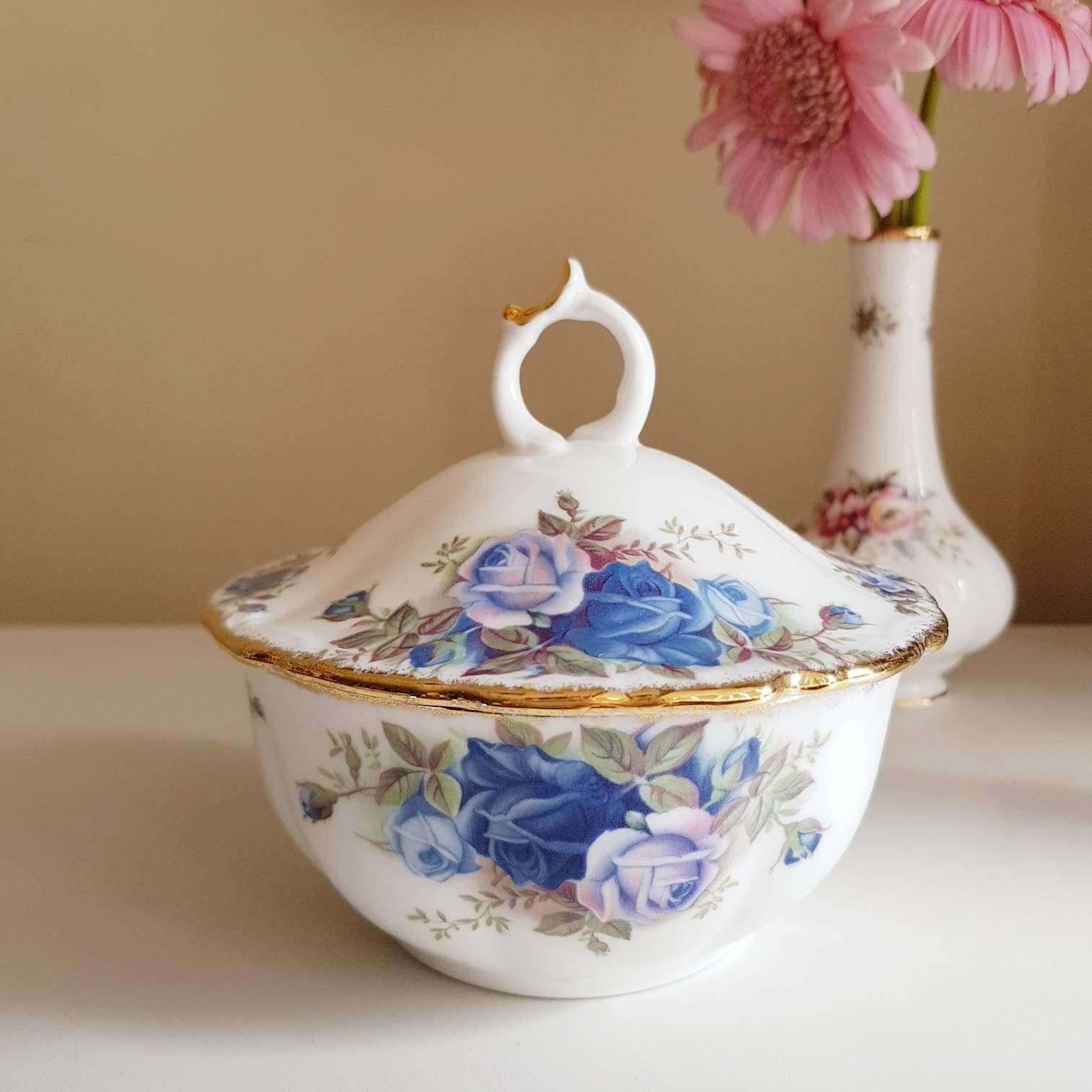 A timeless accent for your tea table or sideboard, this Royal Albert Moonlight Rose bowl with lid brings a touch of English charm to daily rituals. With its delicate blue rose motif and soft gold trim, it’s a lovely way to store sugar, sweets, or a spoonful of nostalgia.