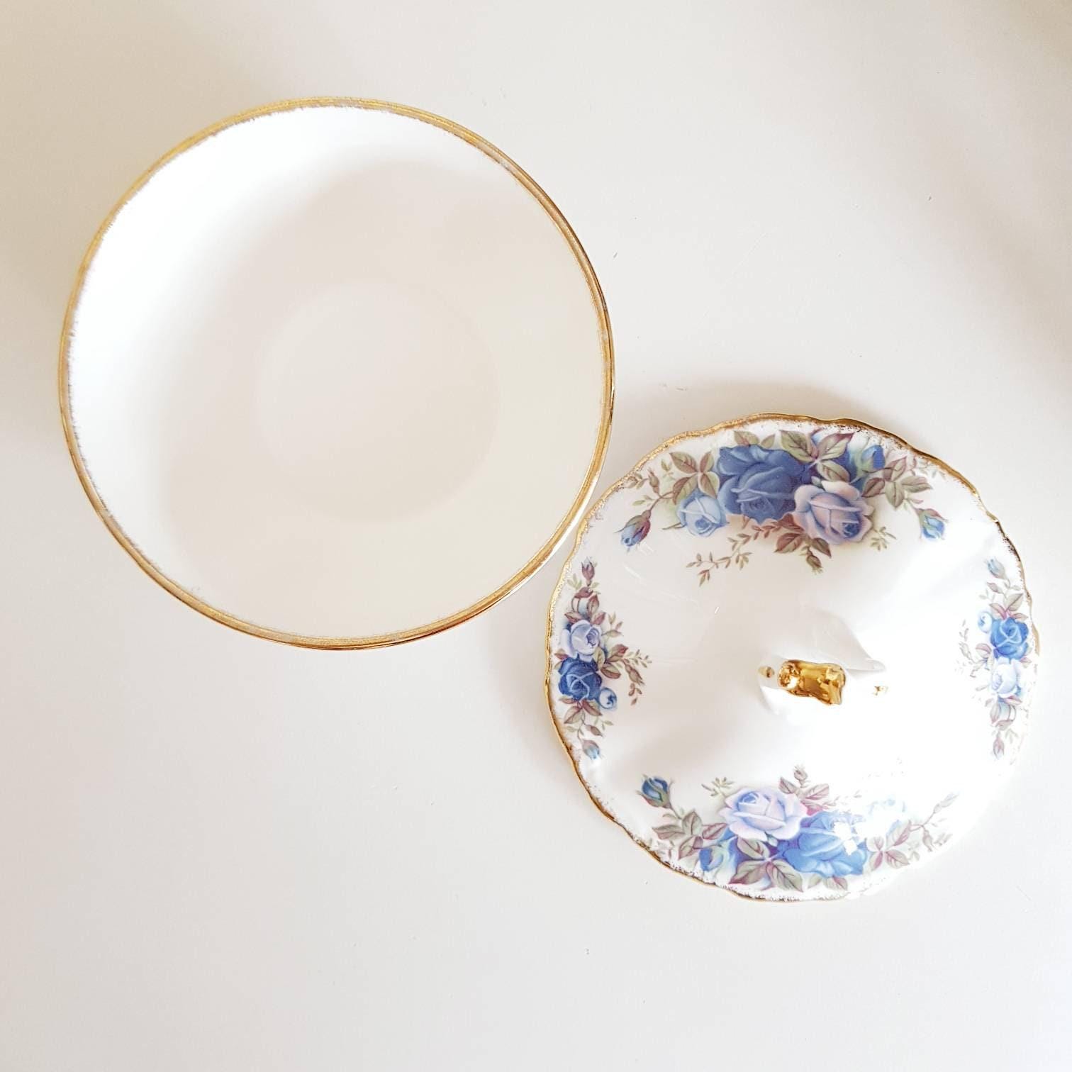 Bone China Candy Bowl with Lid by Royal Albert, Moonlight Rose Pattern, 1987 English Vintage Sugar Pot or Jam Dish