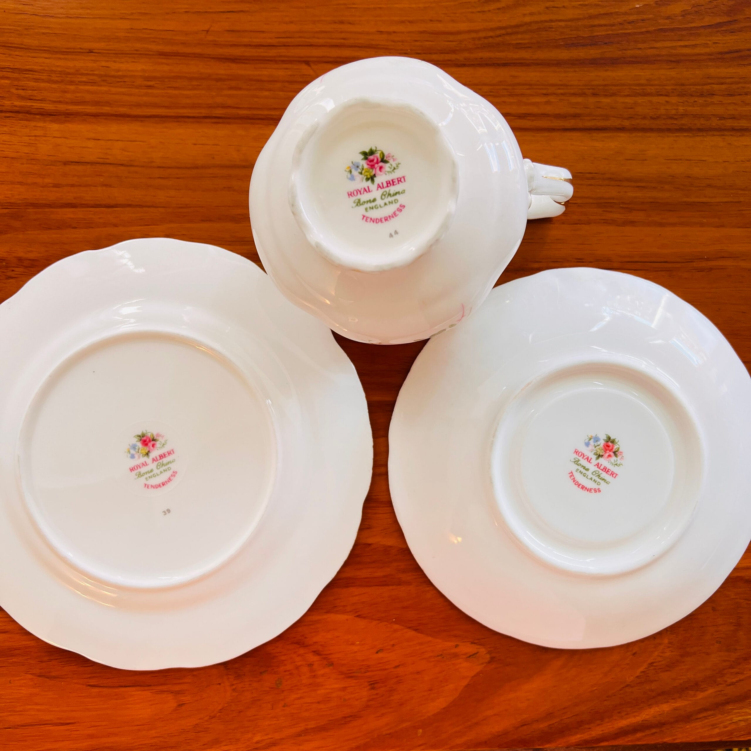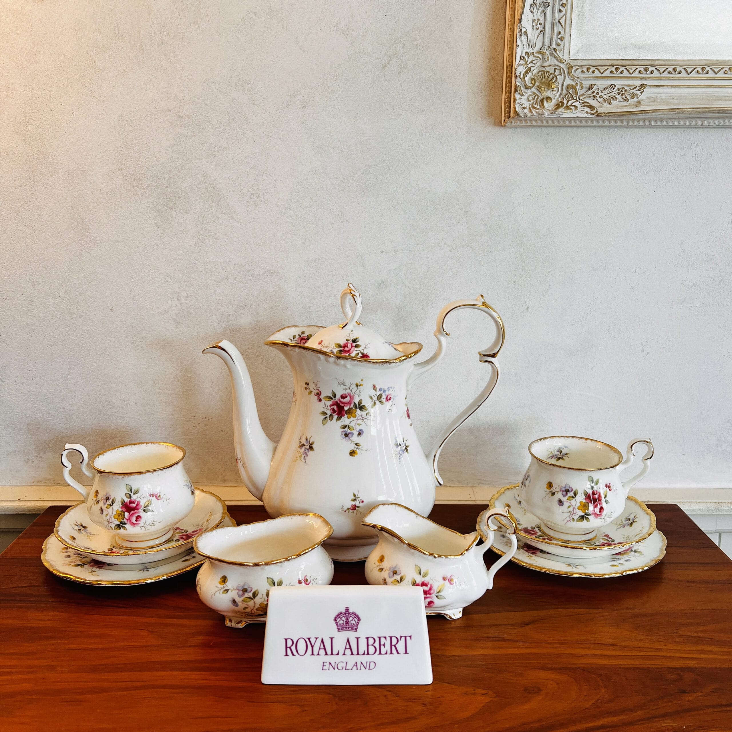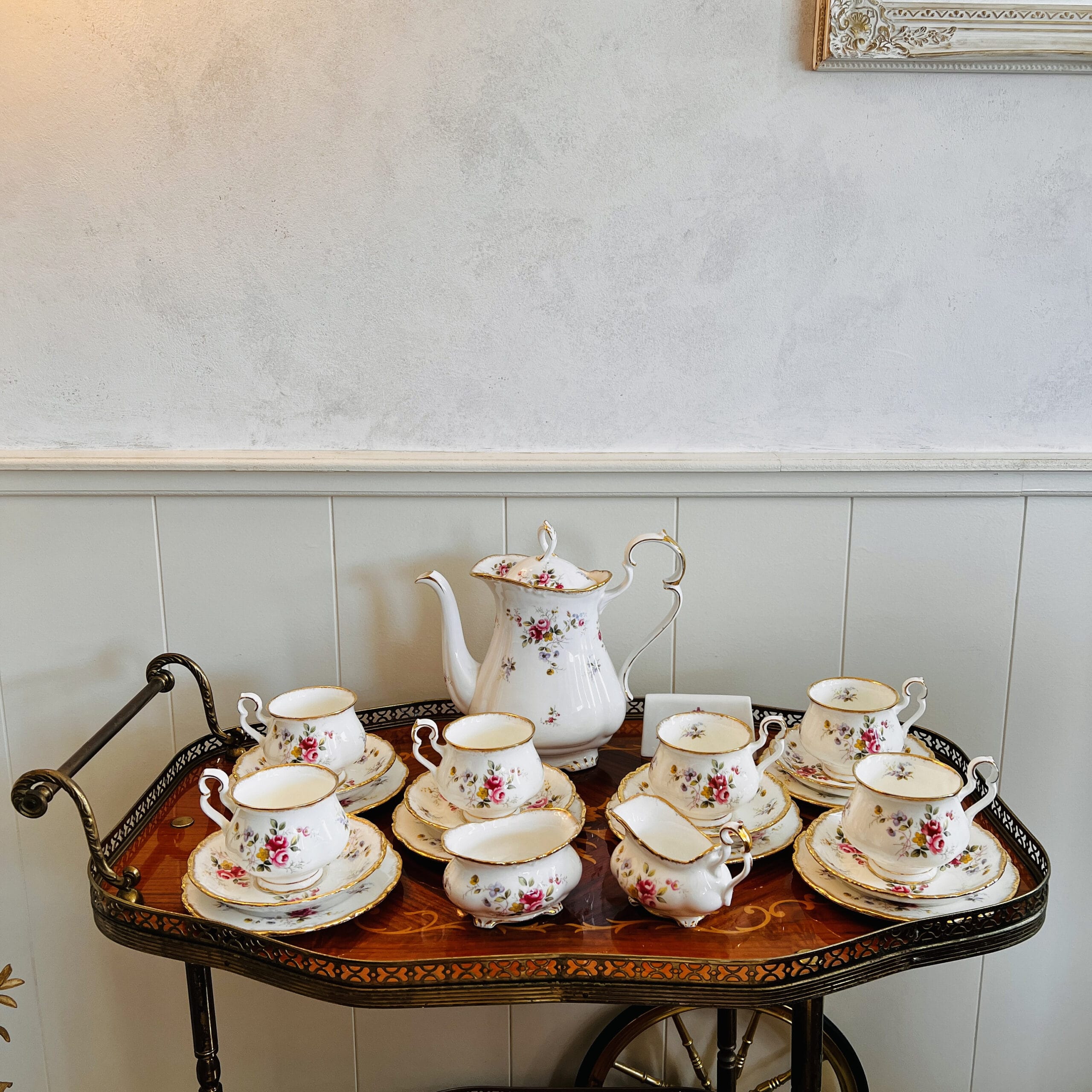 A rare and radiant find, this 21-piece tea and coffee set by Royal Albert is crafted in fine English bone china and adorned in the romantic Tenderness pattern. Delicate roses in soft shades of blue, pink, yellow, and red bloom across the pure white surface, with elegant gold trim highlighting the gently woven edges. The shape is graceful and uncommon, adding a refined charm to any gathering or quiet morning ritual.