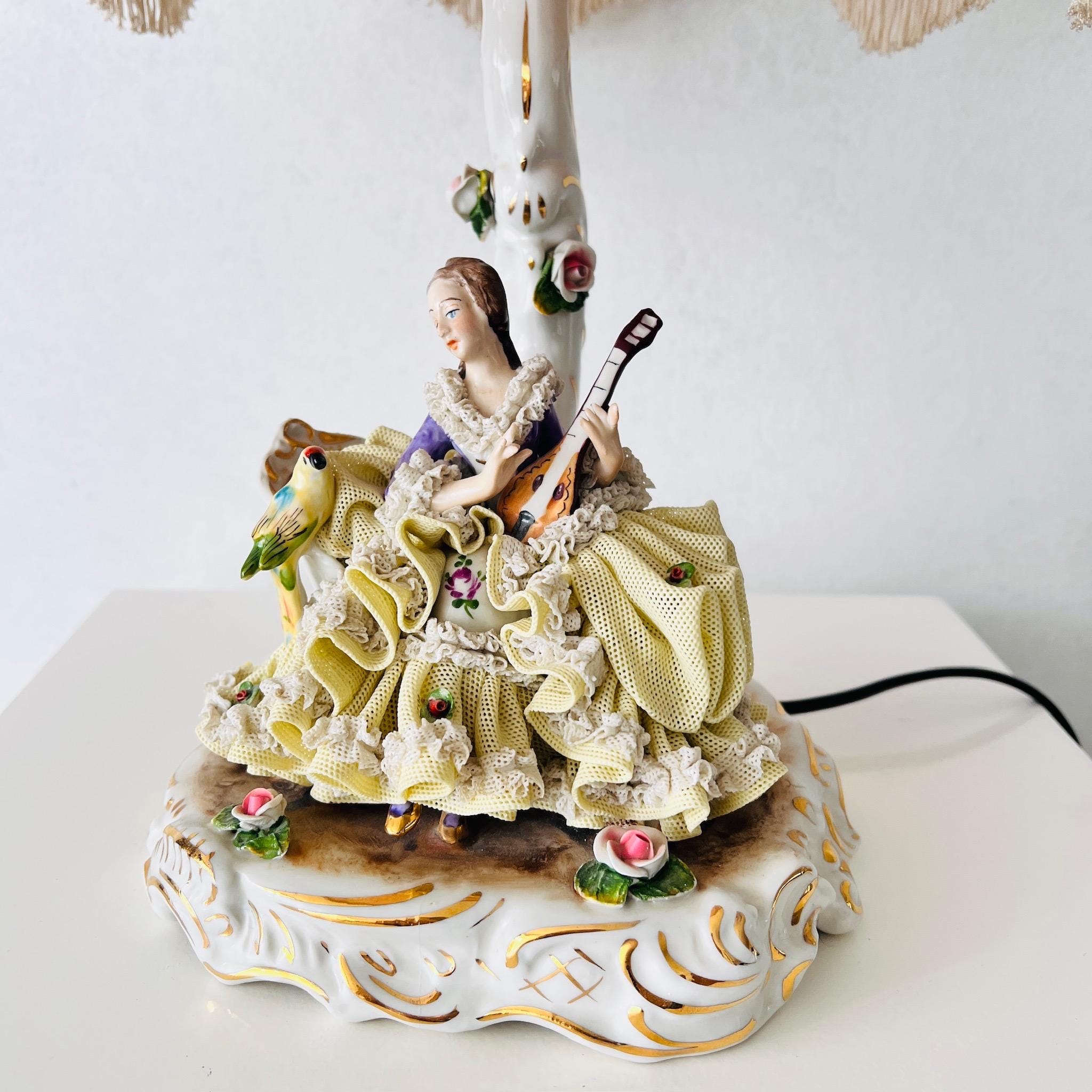 • Style: Victorian-inspired lady figure with intricate ruffled porcelain lace and gilt trim