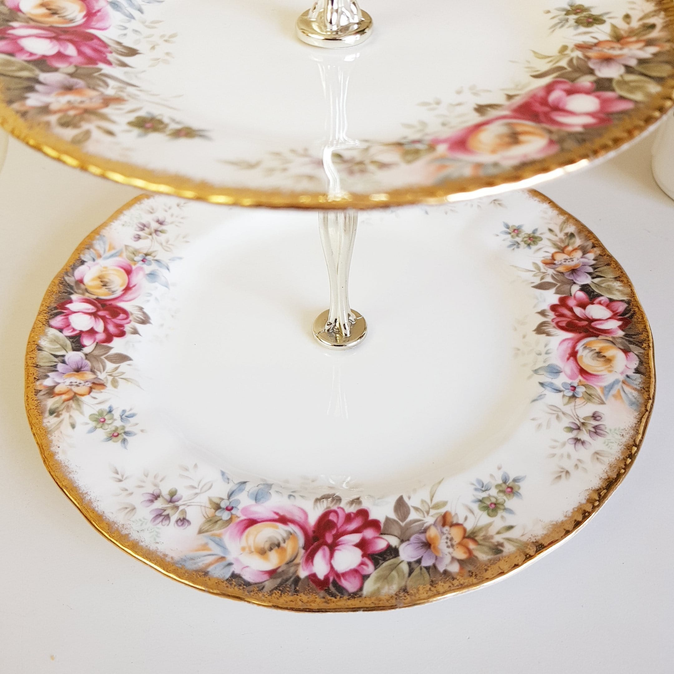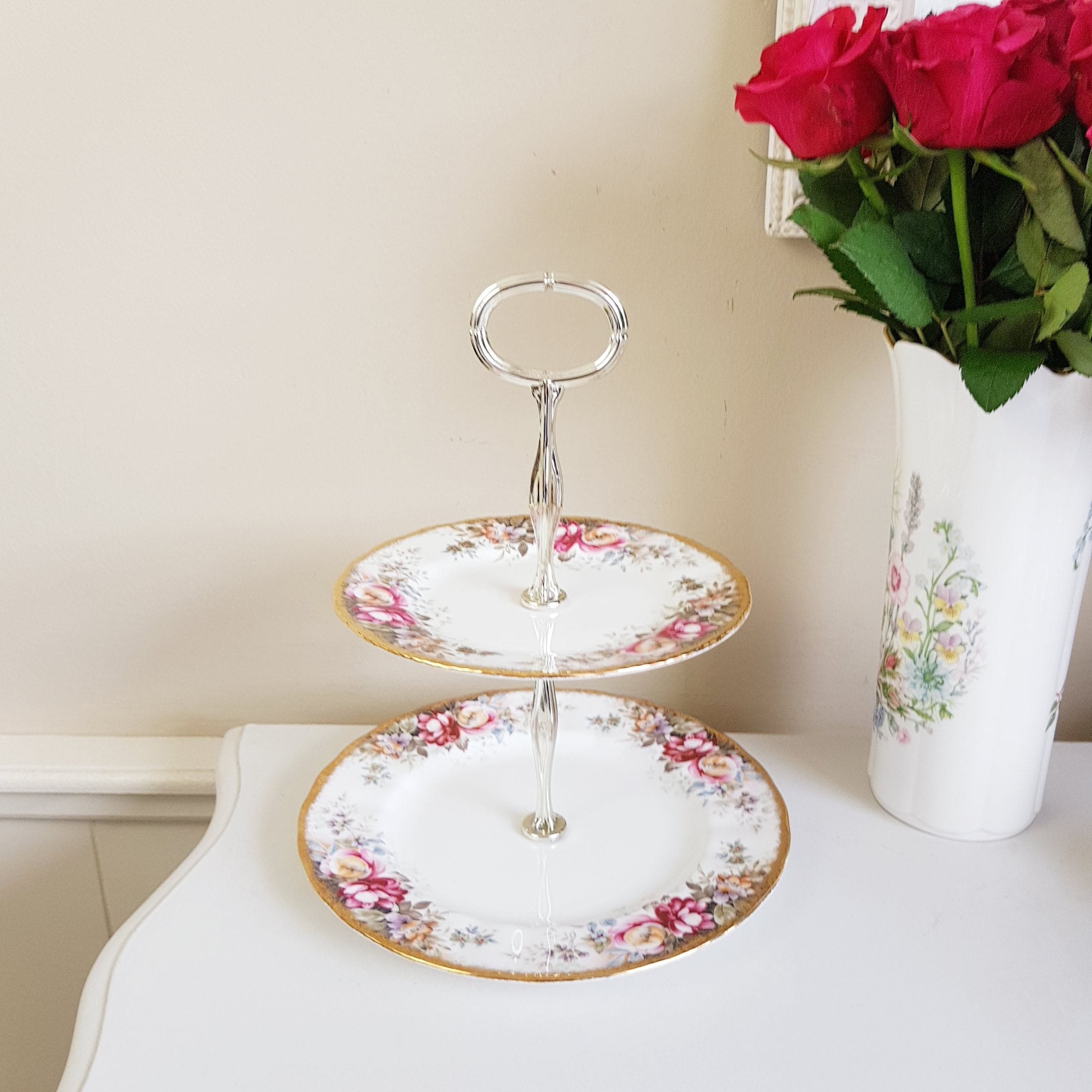 Vintage Queen Anne, Summer Rose Pattern, Fine Bone China, Double Tier with Metal Handle. Cookies, muffins ….cake stand. Made in England.