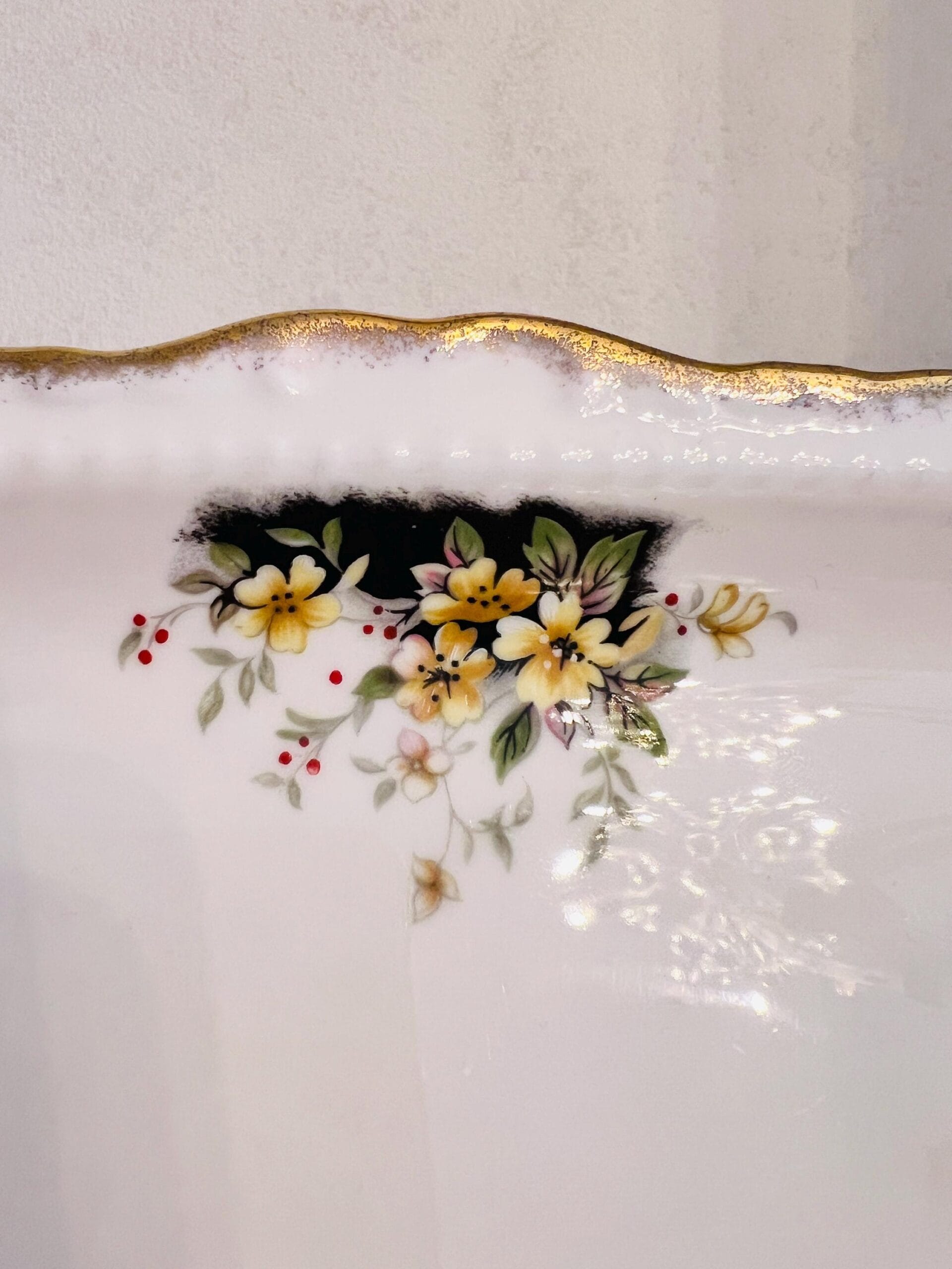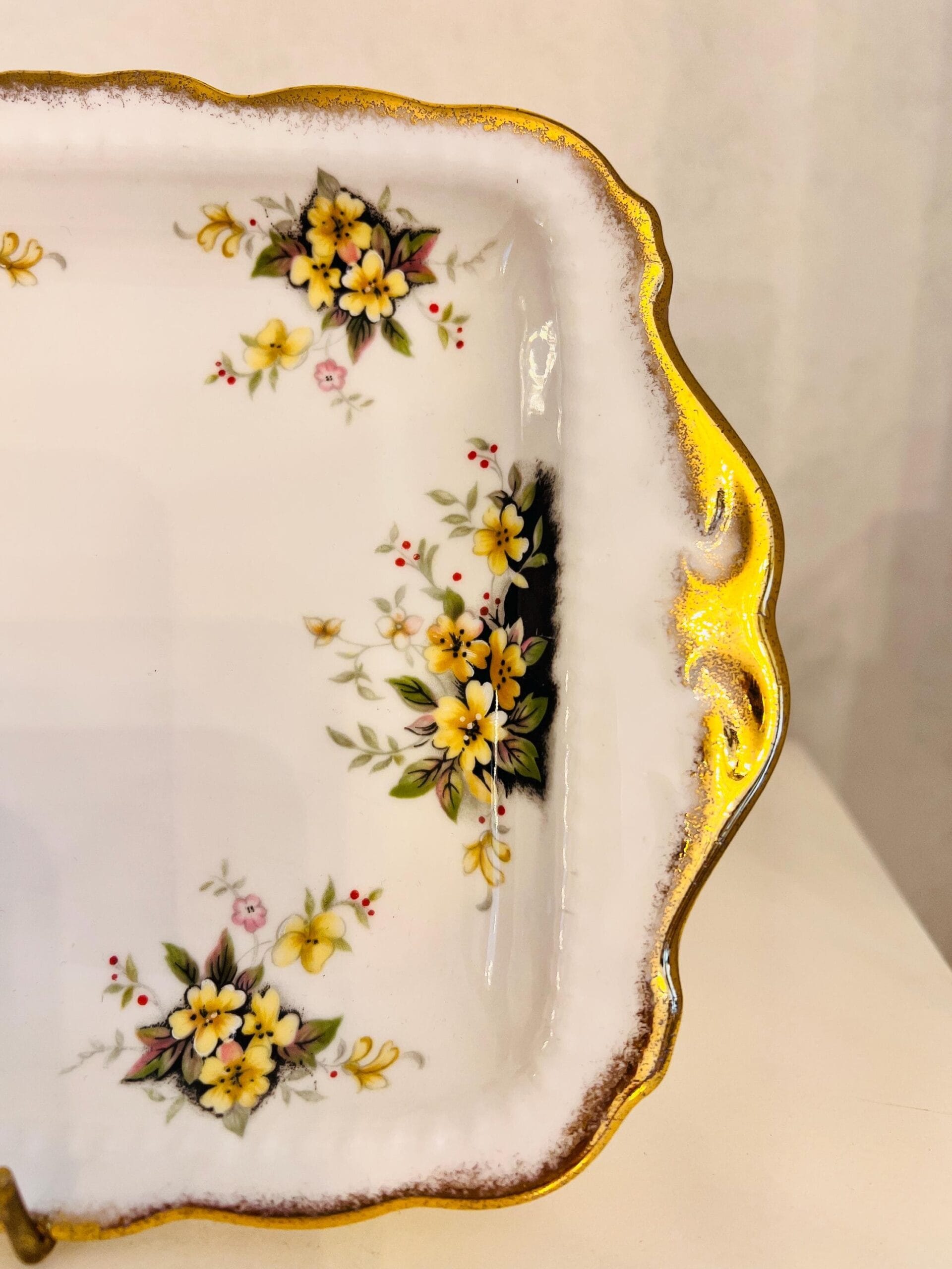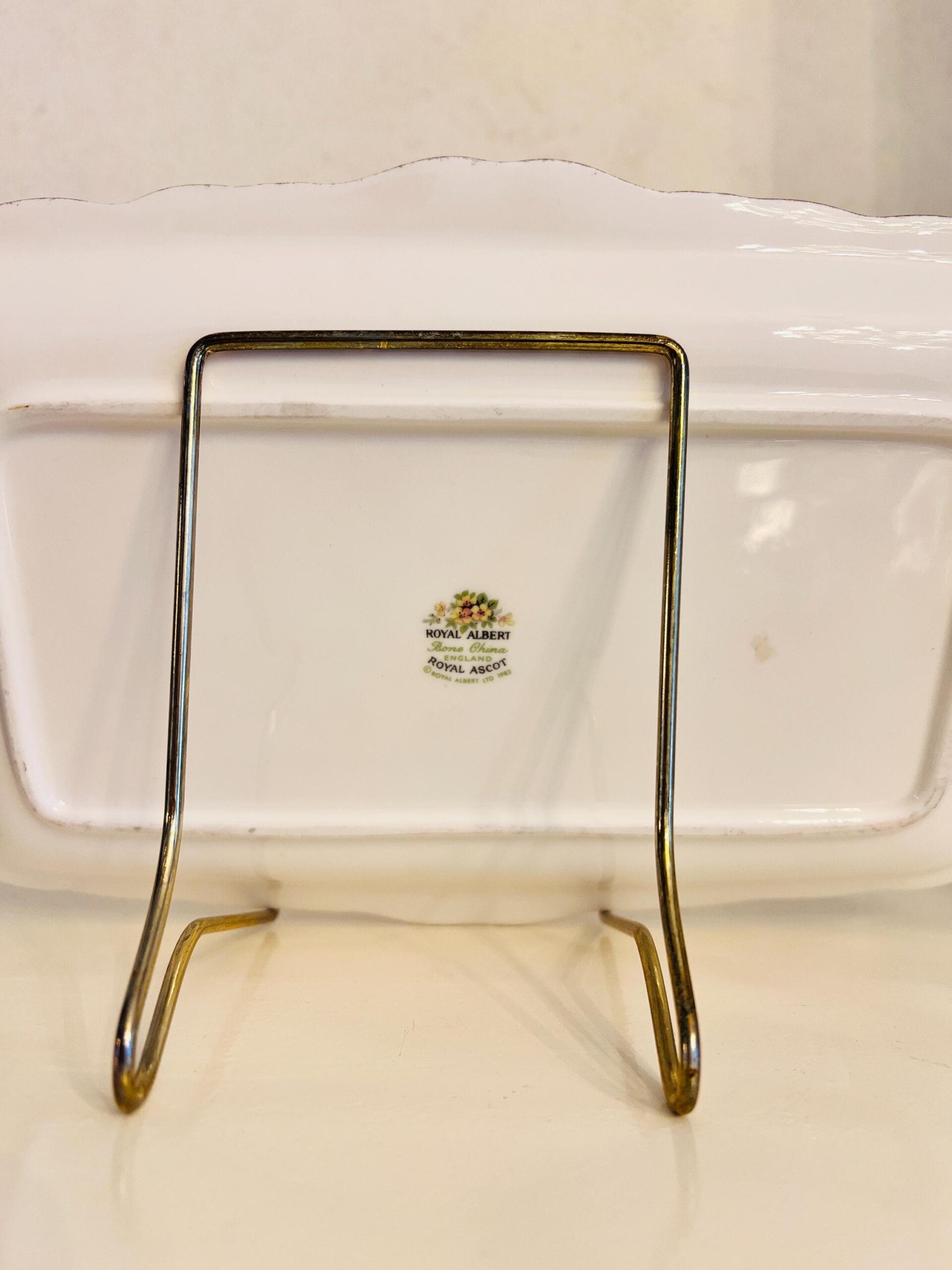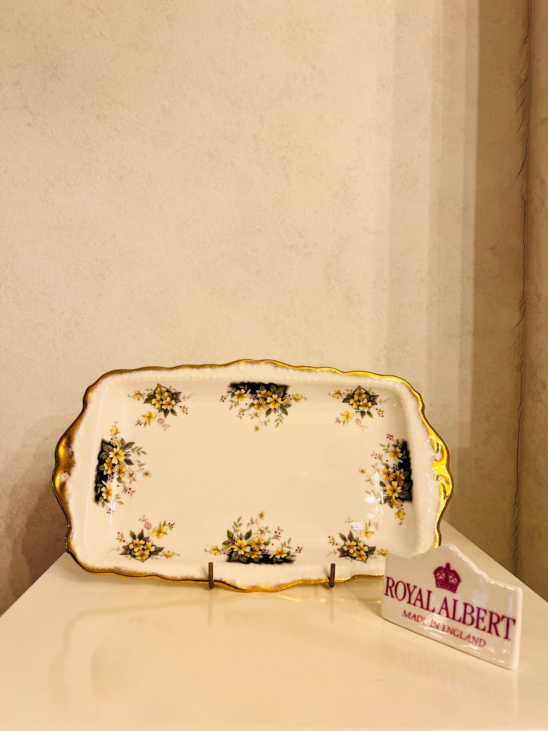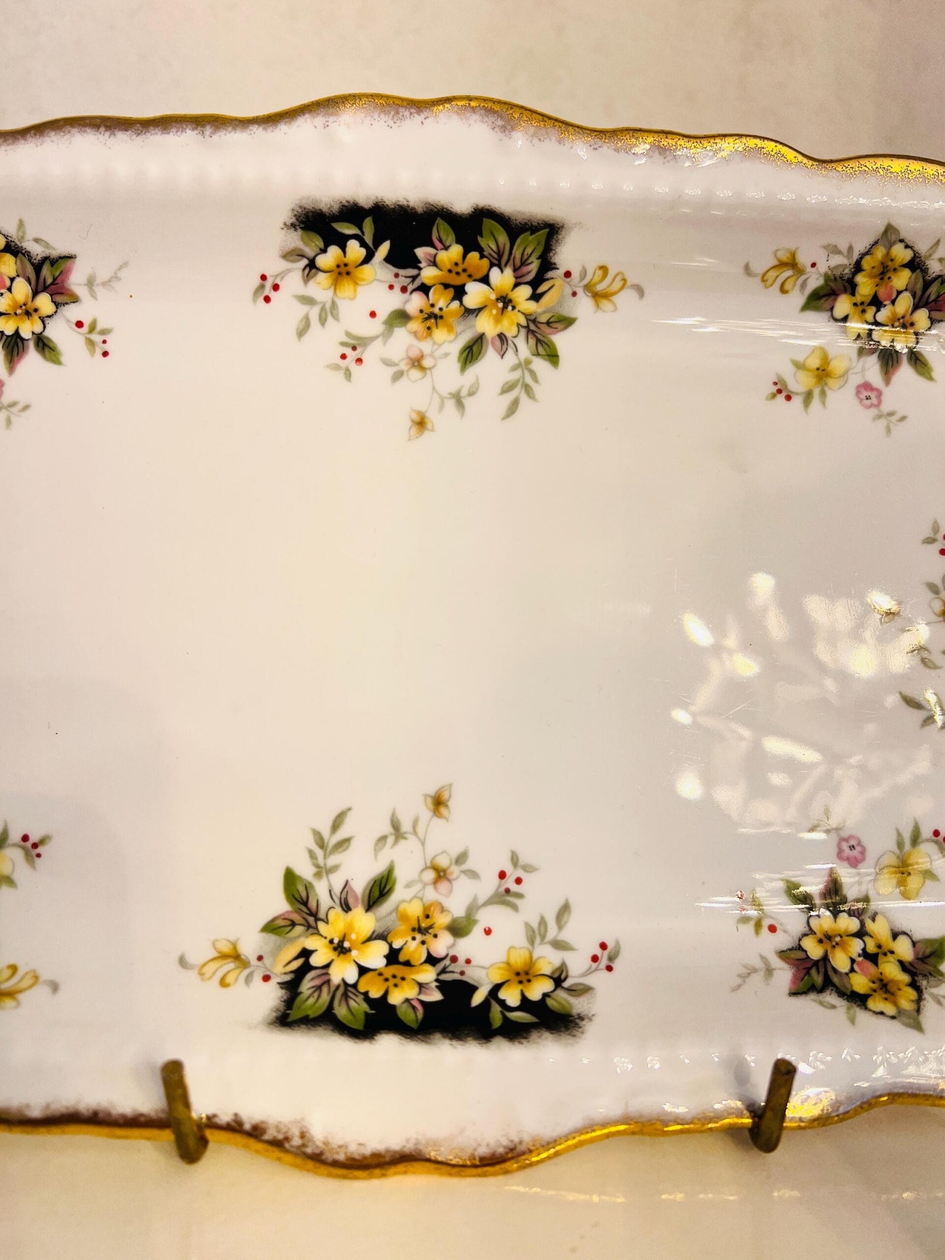 This is a Royal Albert ‘Royal Ascot’ bone china sandwich/cookies/pastry… plate, in a lovely pattern and multicolor flowers. Gilded edges at the handles.