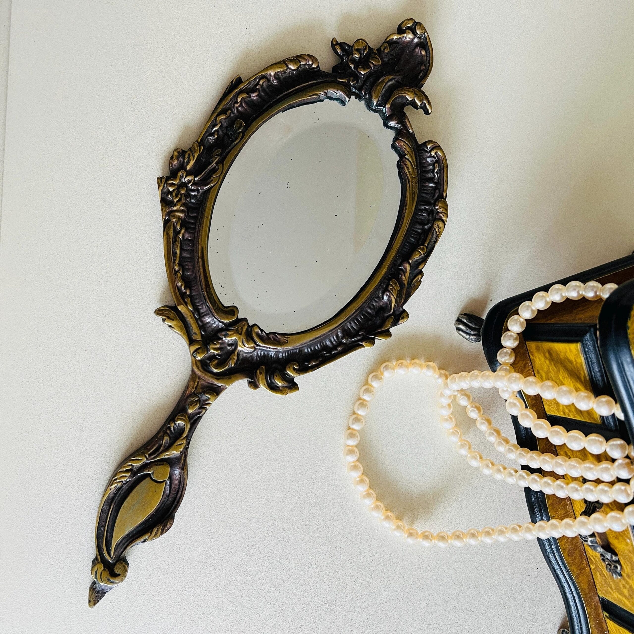Grace your vanity table with a timeless touch. This brass hand mirror features a beautifully ornate frame and classic beveled glass, offering both elegance and everyday function. A lovely piece for anyone who cherishes vintage rituals or wants to bring nostalgic charm to their space.
